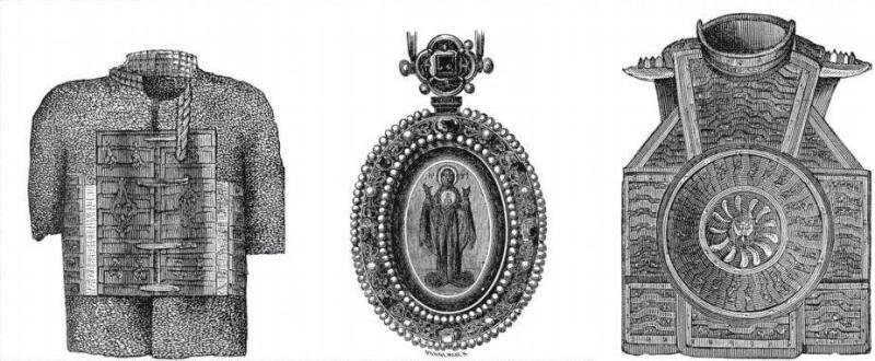 Слева направо: бахтерец боярина Никиты Ивановича Романова, панагия патриарха Филарета, зерцало царя Михаила Федоровича.