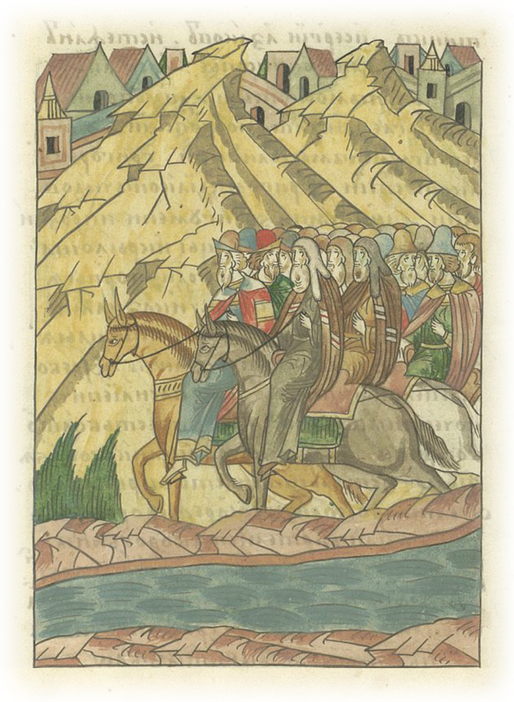 Три архимандрита, множество дьконов, игуменов, пресвитеров, иноков, клирошан, а также бояр, лучших дворовых людей князя и слуг отправляются с Митяем в Царьград к патриарху на поставление его митрополитом. Это многочисленное посольство переходит через Ряза