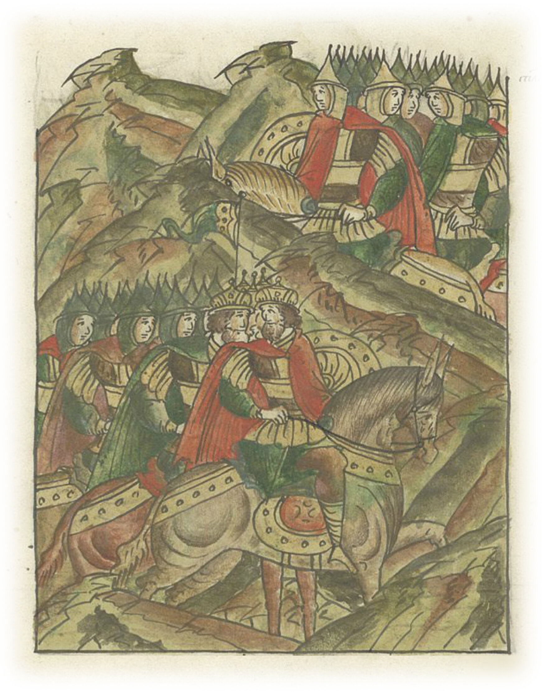 Услышав это, князь Юрий сел на коня, с братом Святославом и с племянниками своими: с Васильком, и Всеволодом, и с Владимиром, и с мужами своими, и пошли против нечестивых.