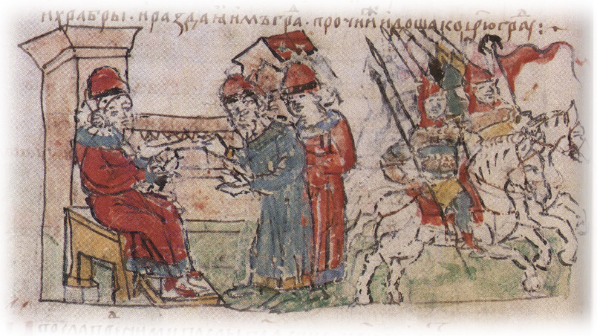 "По сем реша варязи Володимиру: «Се град нашь. Мы прияхом: да хощем окуп имати на них по 2 гривне от человека»... Он же рече им: «Идете». И избра от них мужи добры и смыслены, и храбры, и раздая им грады. Прочий же идоша ко Царюграду".