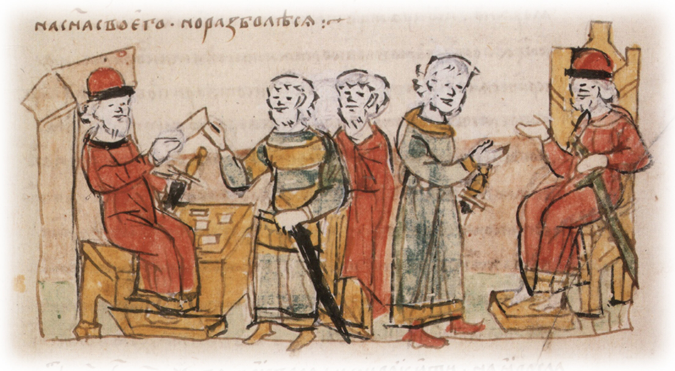 Айналов Д. В. О некоторых сериях миниатюр Радзивиловской летописи // Известия Отделения русского языка и словесности императорской Академии наук (далее: ИОРЯС). СПб., 1909. Т. 13. Кн. 2. с. 314; Арциховский А. В. Древнерусские миниатюры как исторический источник. М./1944. с. 14; Белоброва О. А. Этикетный мотив в древнерусской миниатюре XV в. // Исследования по древней и новой литературе: 80-летию академика Д. С. Лихачева посвящается. Л., 1987. С. 25—31. с. 26.