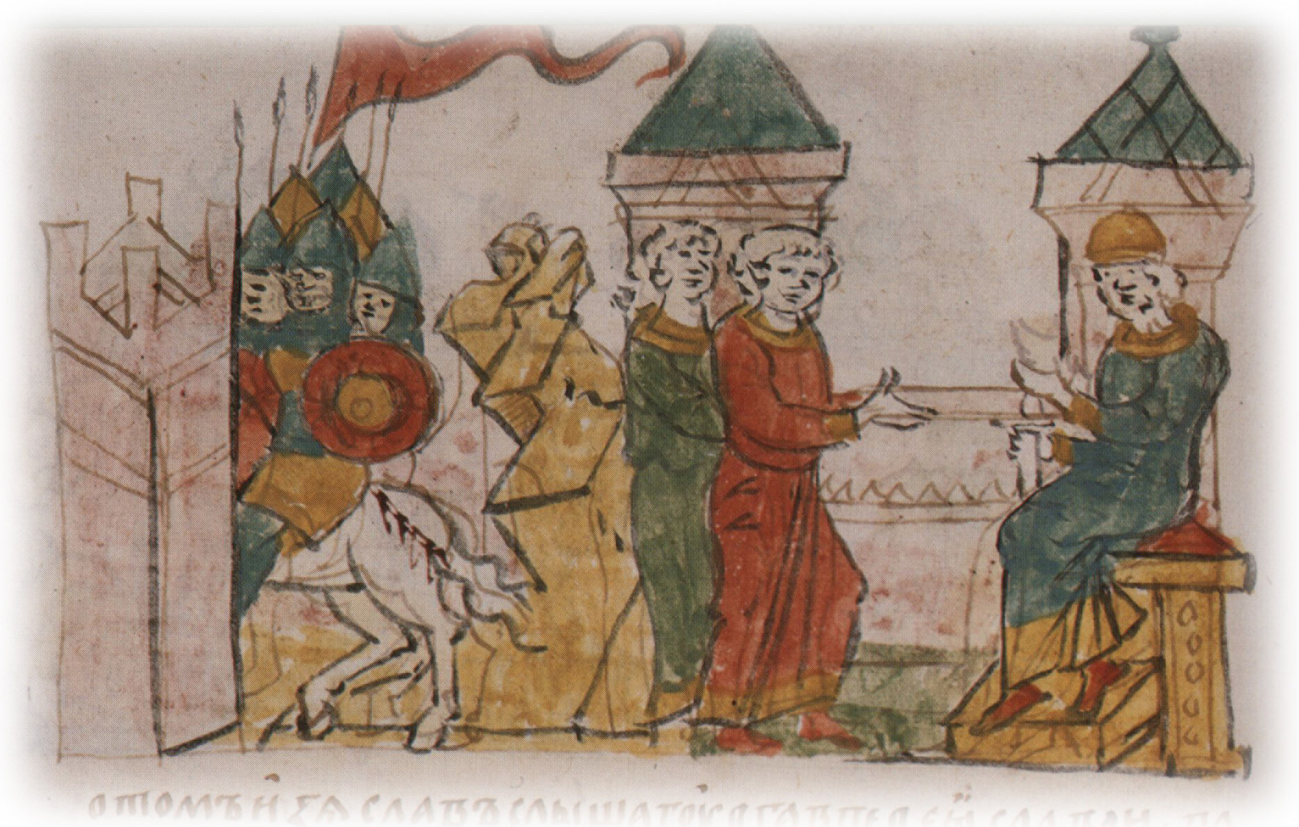 Рисунок "мастера Б" — перо. Правлен (фигуры, лица, шапка, наконечники копий, щит, стол, архитектура, лошадь, лещадка) и дополнен (знамя) "мастера В" — кисть.