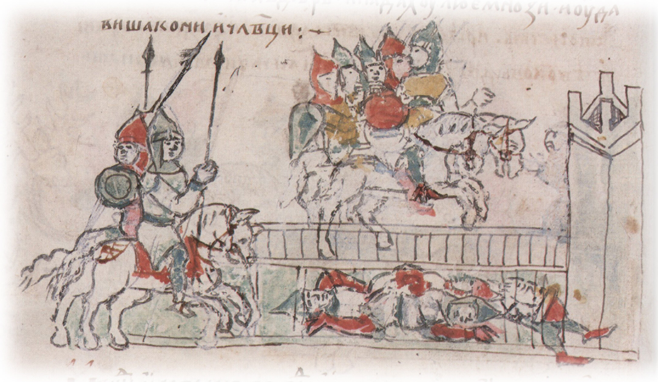 Гибель Олега Святославича и многих его воинов, сбитых с моста в ров у городских ворот Овруча.