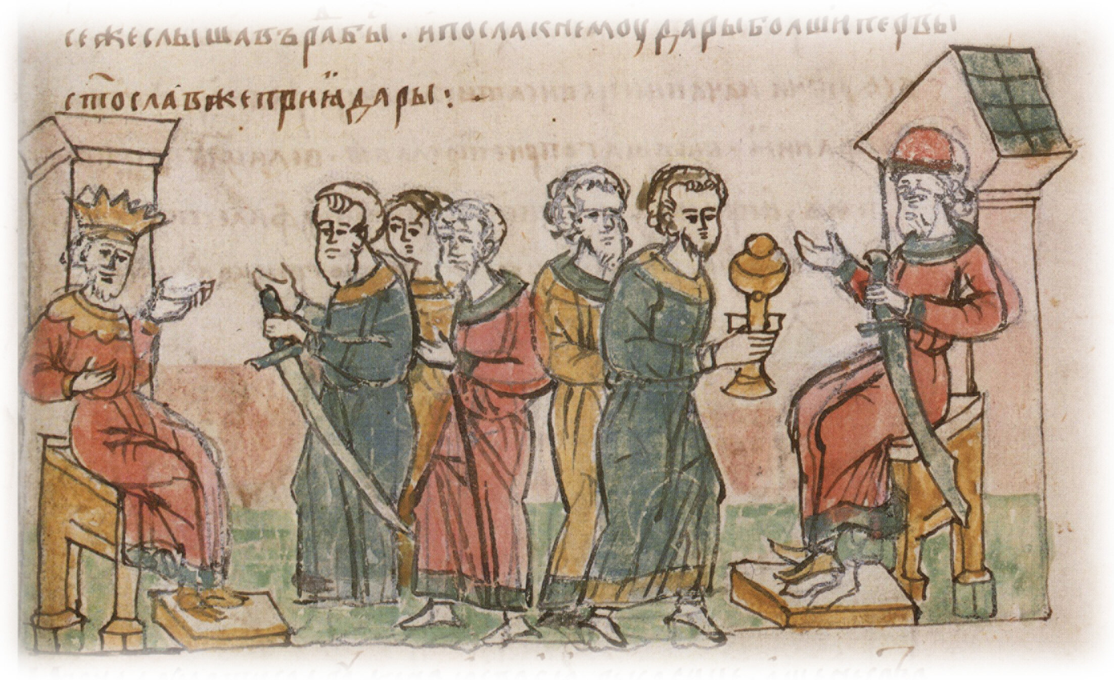 "И посла послы ко цареви, в Деръстре, бо ту царь, река сице: «Хочю имети мир с тобою тверд и любовь». Се же слышав рад бысть, и посла к нему дары болши первых. Святослав же прия дары".