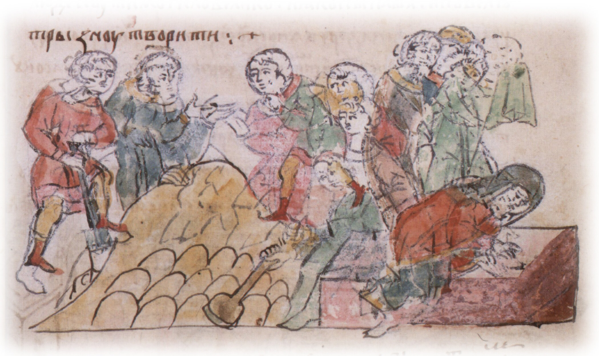 Тайное погребение Владимира Святославича, умершего в Берестове: спуск его тела на землю на ковре между разобранными клетьми здания; положение тела Владимира в мраморный гроб в церкви Святой Богородицы.