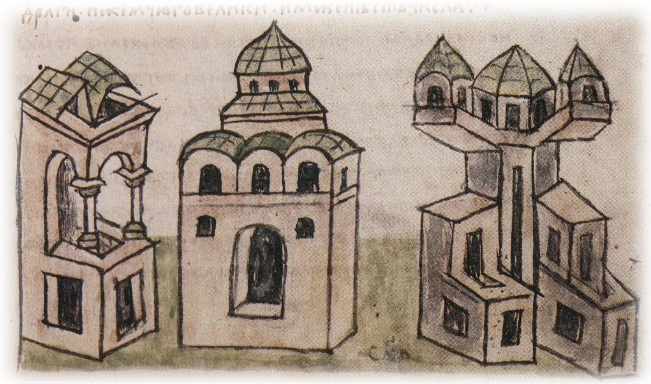 Условное изображение города Владимира (справа), Успенского собора в архитектурных формах времени Андрея Боголюского (!) и великокняжеского терема (слева), пострадавших от пожара.