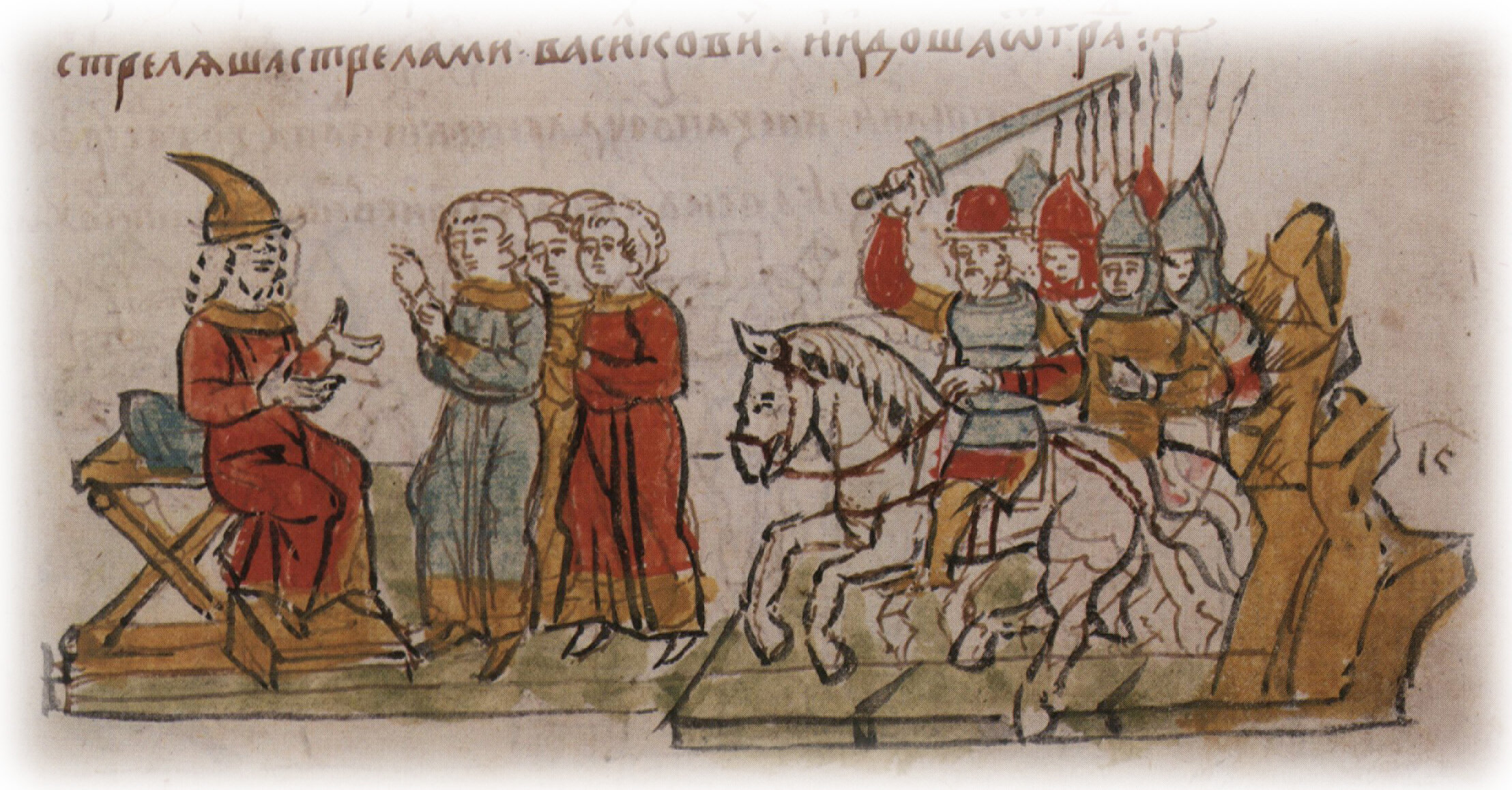 Рисунок "мастера Б" — перо. Правлен (фигуры, лицо князя, шапка, шлемы, копья, стол, лошади, лещадка) "мастера В" — кисть. Позднейшая пририсовка сбруи—перо.