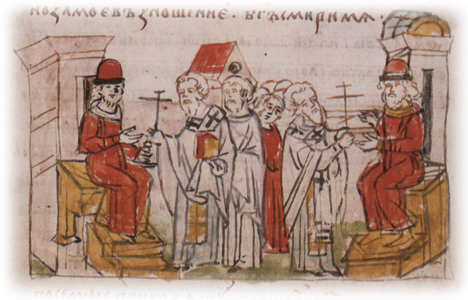 "И начаша межи собою мужи слати, и умиришася на сем... Святополк же емъся по се, и целоваше крест межи собою, мир створише".