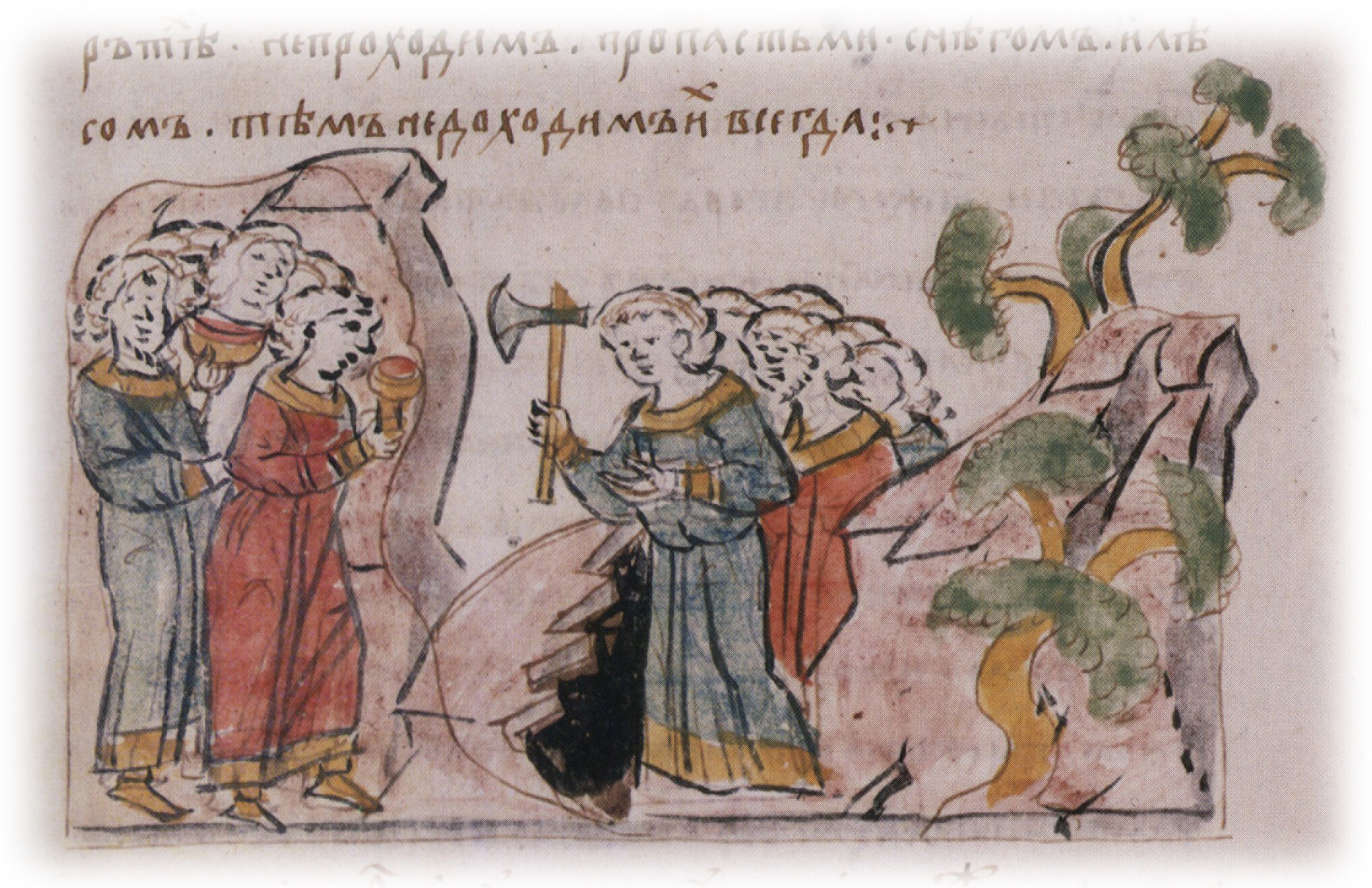 "...преже сих 4 лет, еже ми сказа Гурята Рогович новгородець... и в горах тех клич велик и говор, и секоть гору, хотяче просечися, ...просяще железа, аще кто дастъ им железо, или ножь, или секиру, и они дають скорою противу".