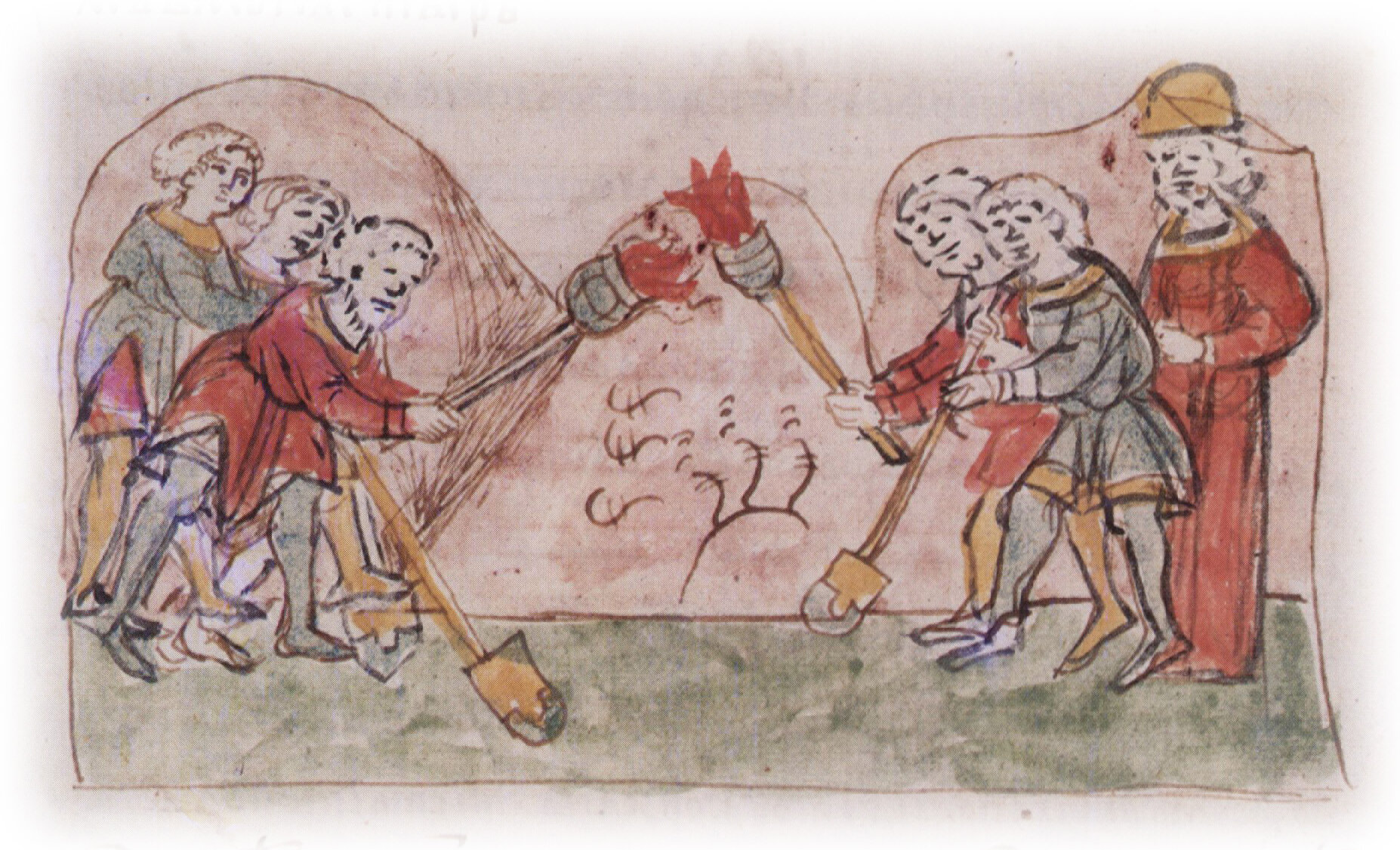 Рисунок "мастера Б" — перо. Правлен (фигуры, лица, шапка, лопата слева, факелы) "мастера В" — кисть.