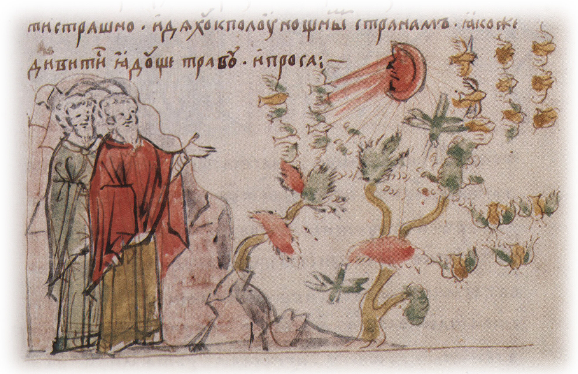 "В се же лето приидоша прузи и покрыта землю, и бе видети страшно, идяху к полунощным странам, якоже дивитися, ядуще траву и проса".