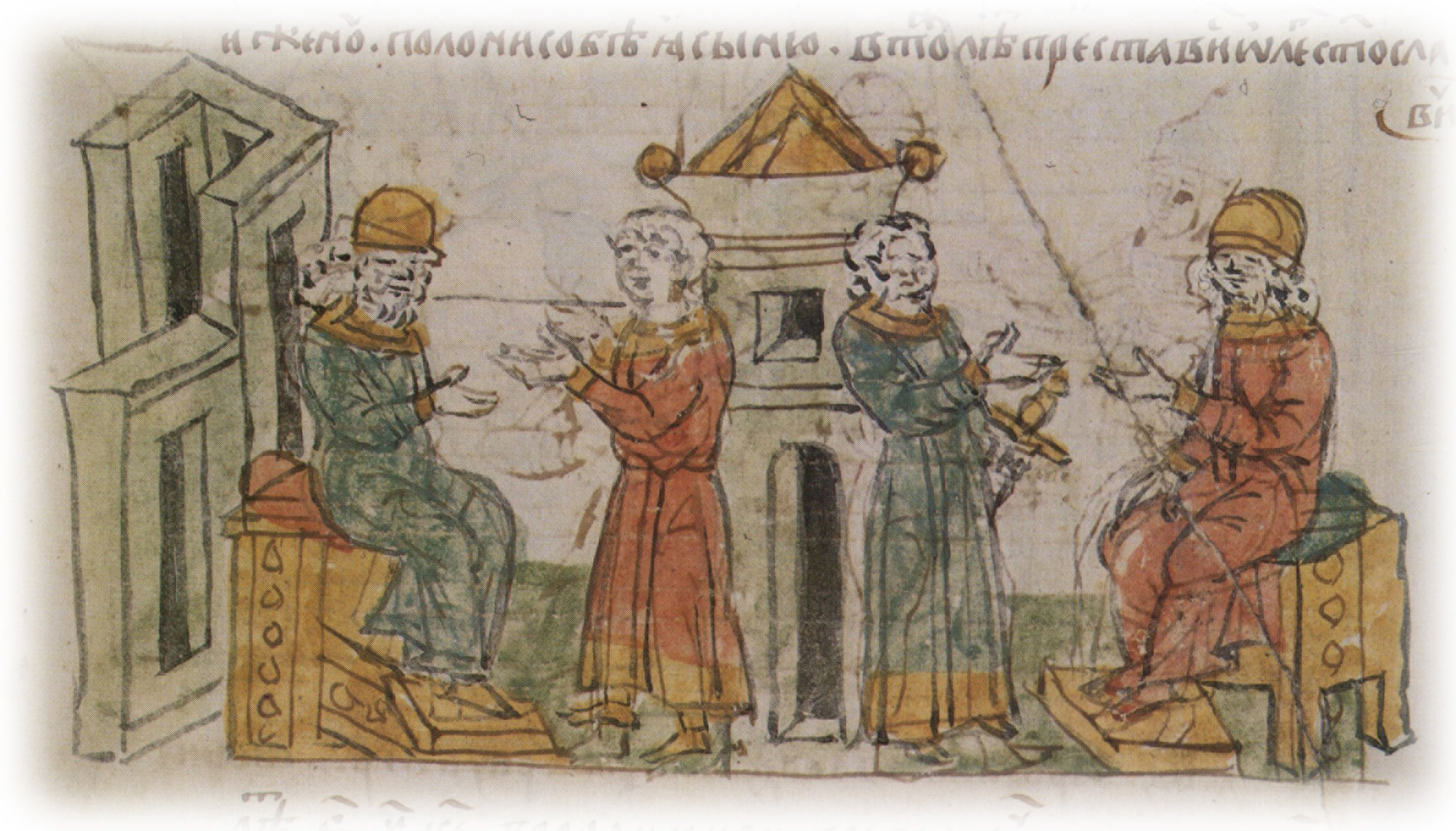 Рисунок "мастера Б" — перо. Правлен (фигуры, лица, шапки, рукоять меча, столы, архитектура) и дополнен (архитектура слева) "мастера В" — кисть.