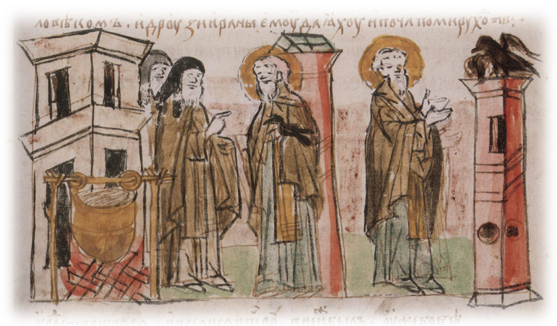 Рисунок "мастера Б" — перо. Правлен (фигуры, лица, клобуки, дрова в очаге, птица, архитектура) и дополнен(нимбы) "мастера В" — кисть.