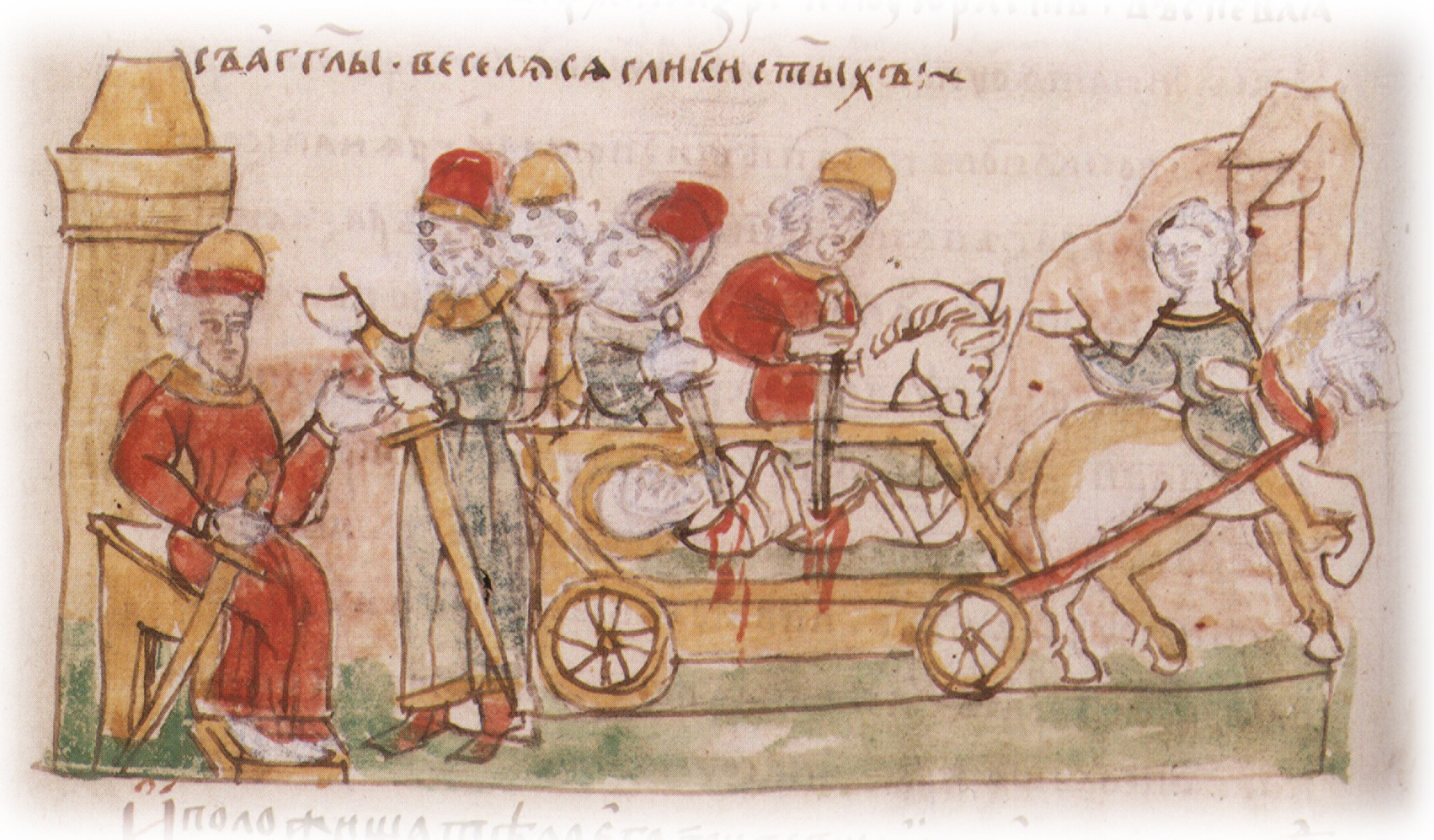 Перевозка на телеге раненого Бориса Владимировича и убийство его по приказу Святополка Владимировича.