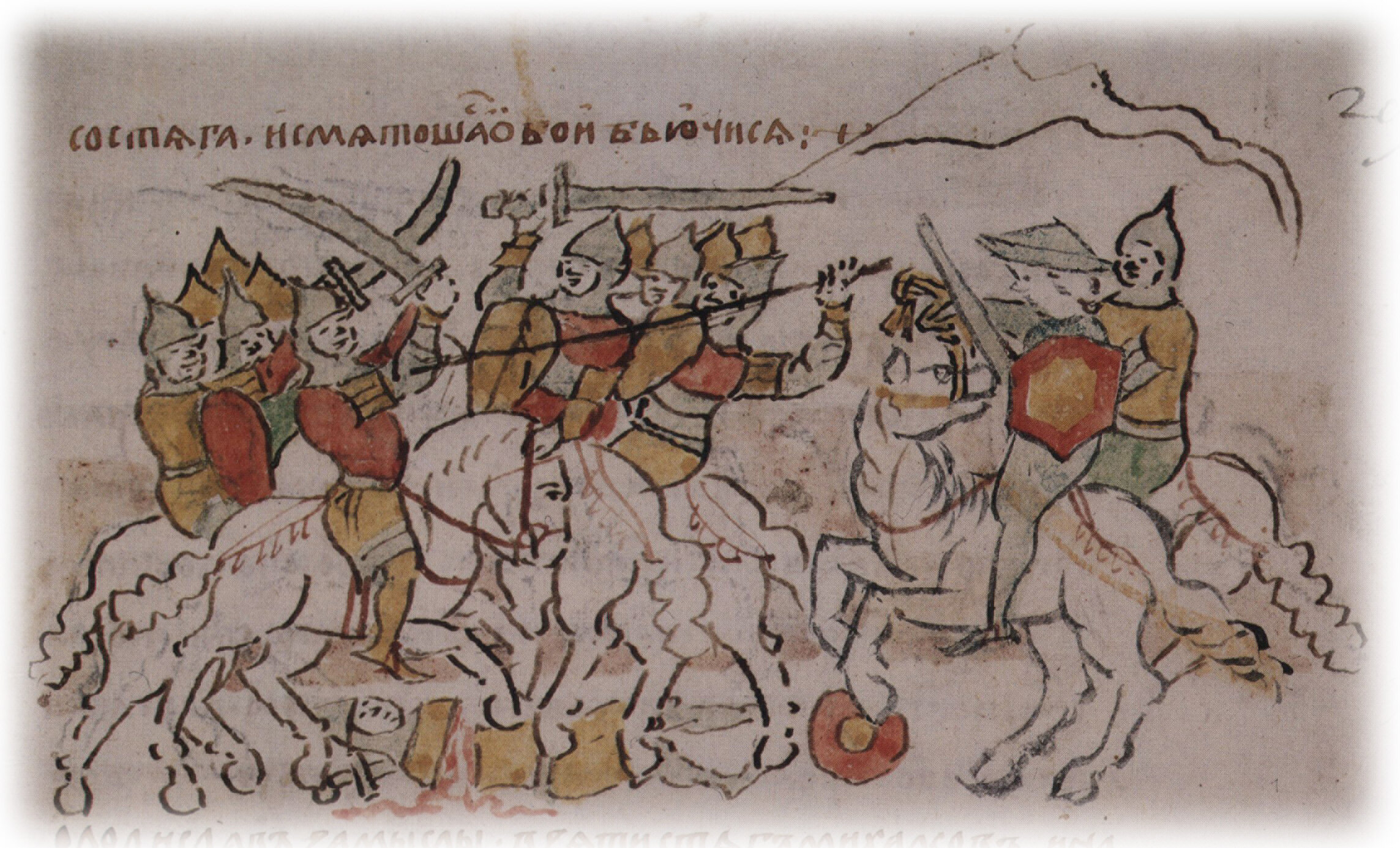 "И сняшася обои, и бысть сеча зла, и потяша стягъвника нашего, и челку стяговую соторгоша со стяга, и смятошася обои бьючися".