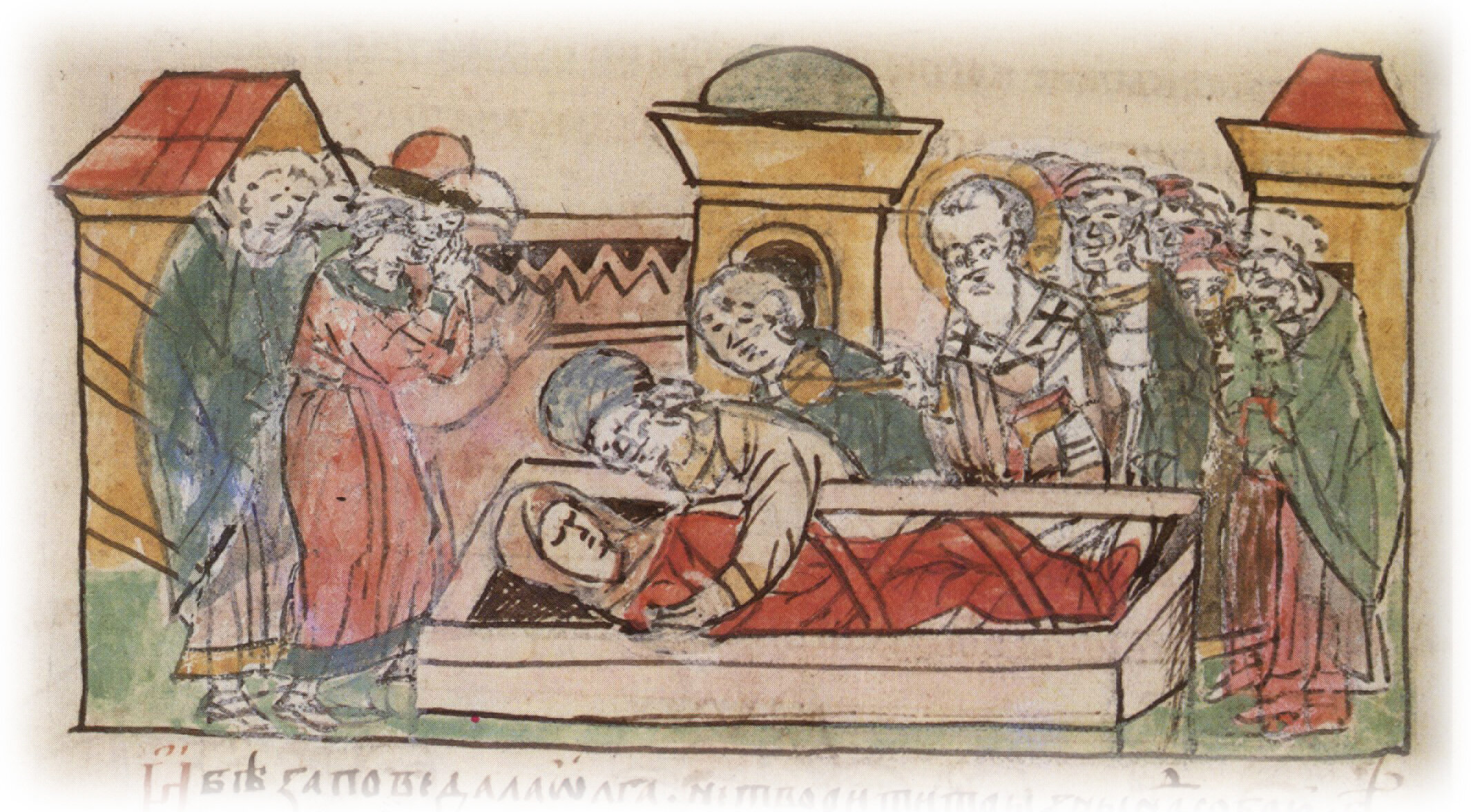 Тайное погребение Владимира Святославича, умершего в Берестове: спуск его тела на землю на ковре между разобранными клетьми здания; положение тела Владимира в мраморный гроб в церкви Святой Богородицы.