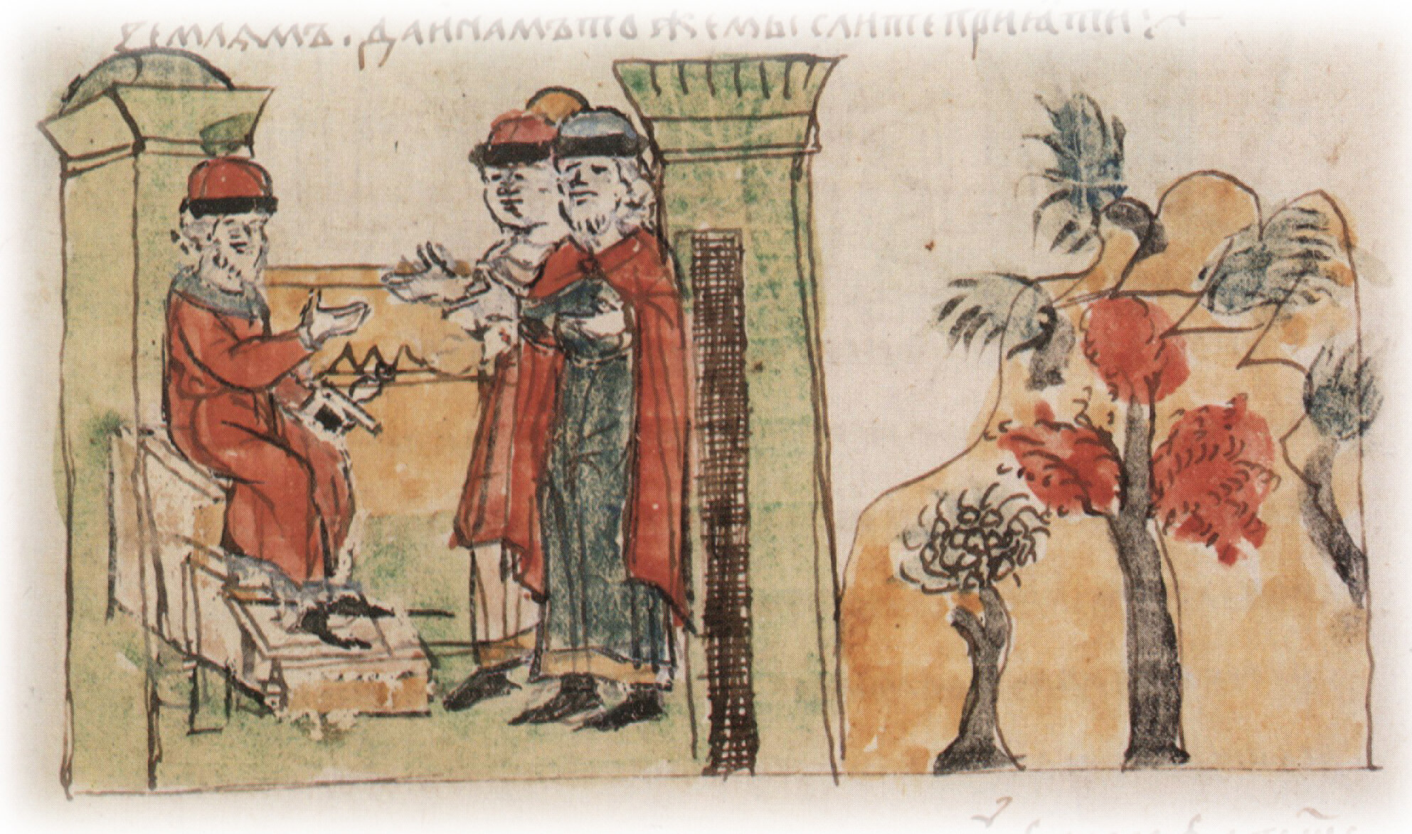 Тайное погребение Владимира Святославича, умершего в Берестове: спуск его тела на землю на ковре между разобранными клетьми здания; положение тела Владимира в мраморный гроб в церкви Святой Богородицы.