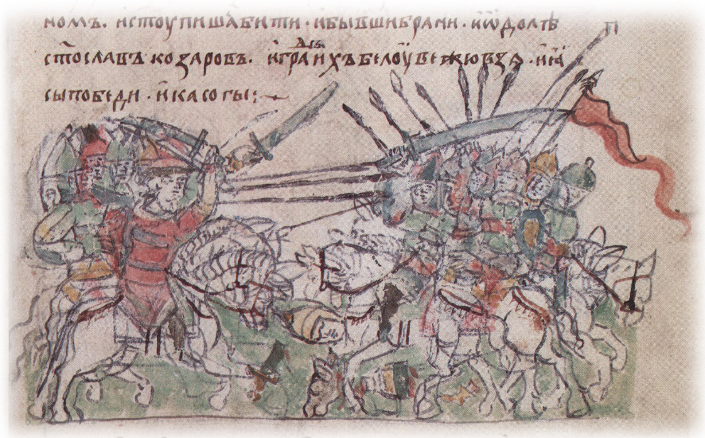 "В лето 6473. Иде Святослав на ко «ары. Слышавши же ко «ары, изидоша противу со князем своим Каганом, и ступиша ся бити. И бывши брани, и одоле Святослав ко «аров...".