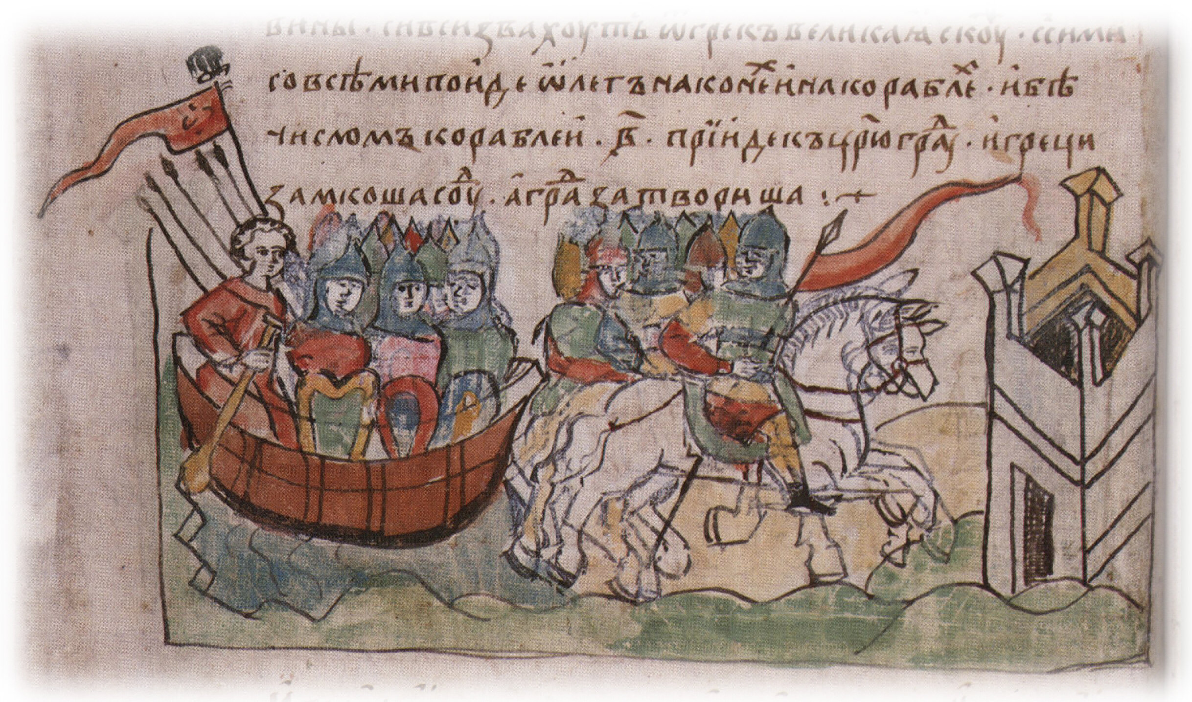 "В лето 6415... С сими со всеми поиде Олег на конех и на кораблех, и бе числом кораблей 2000. Прииде к Царюграду; и греци замкоша Суд, а град затвориша".