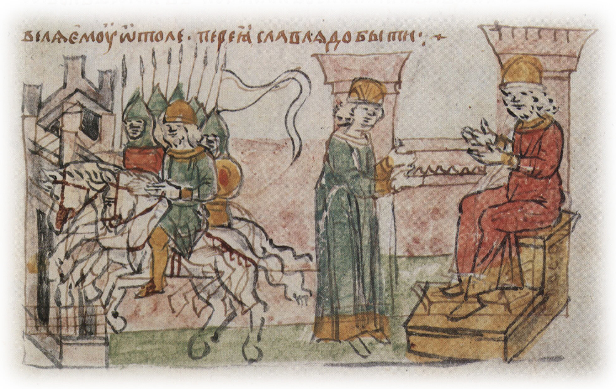 Рисунок "мастера Б" — перо. Правлен (фигуры, лица, шапки, шлемы, щит, наконечники копий,знамя,стол,архитектура слева, лошади) "мастера В" — кисть. Позднейшая пририсовка сбруи и стремени — перо.