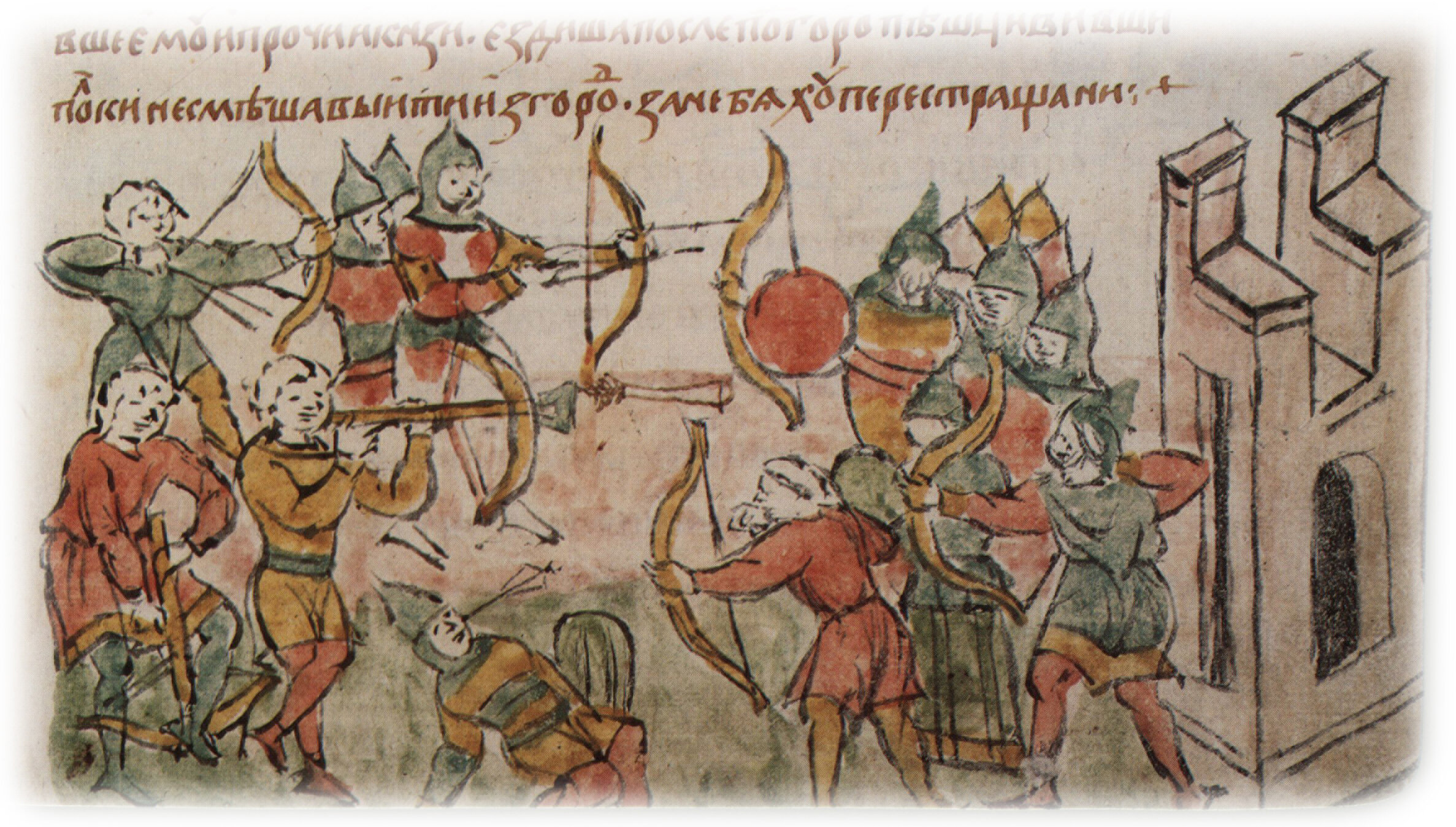 "Вышедшим же пешцем из города стрелятися и толче на нь с дружиною своею и с половци, овы избиша, а другиа вогнаша во дворы".