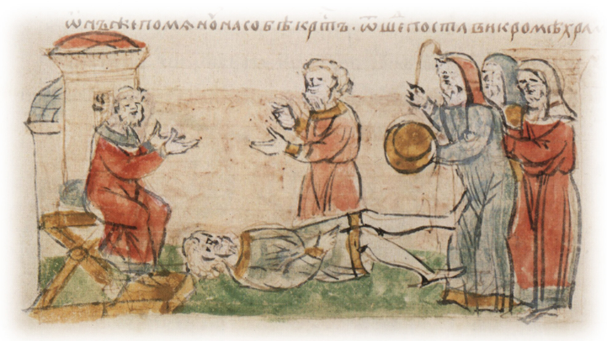 Тайное погребение Владимира Святославича, умершего в Берестове: спуск его тела на землю на ковре между разобранными клетьми здания; положение тела Владимира в мраморный гроб в церкви Святой Богородицы.