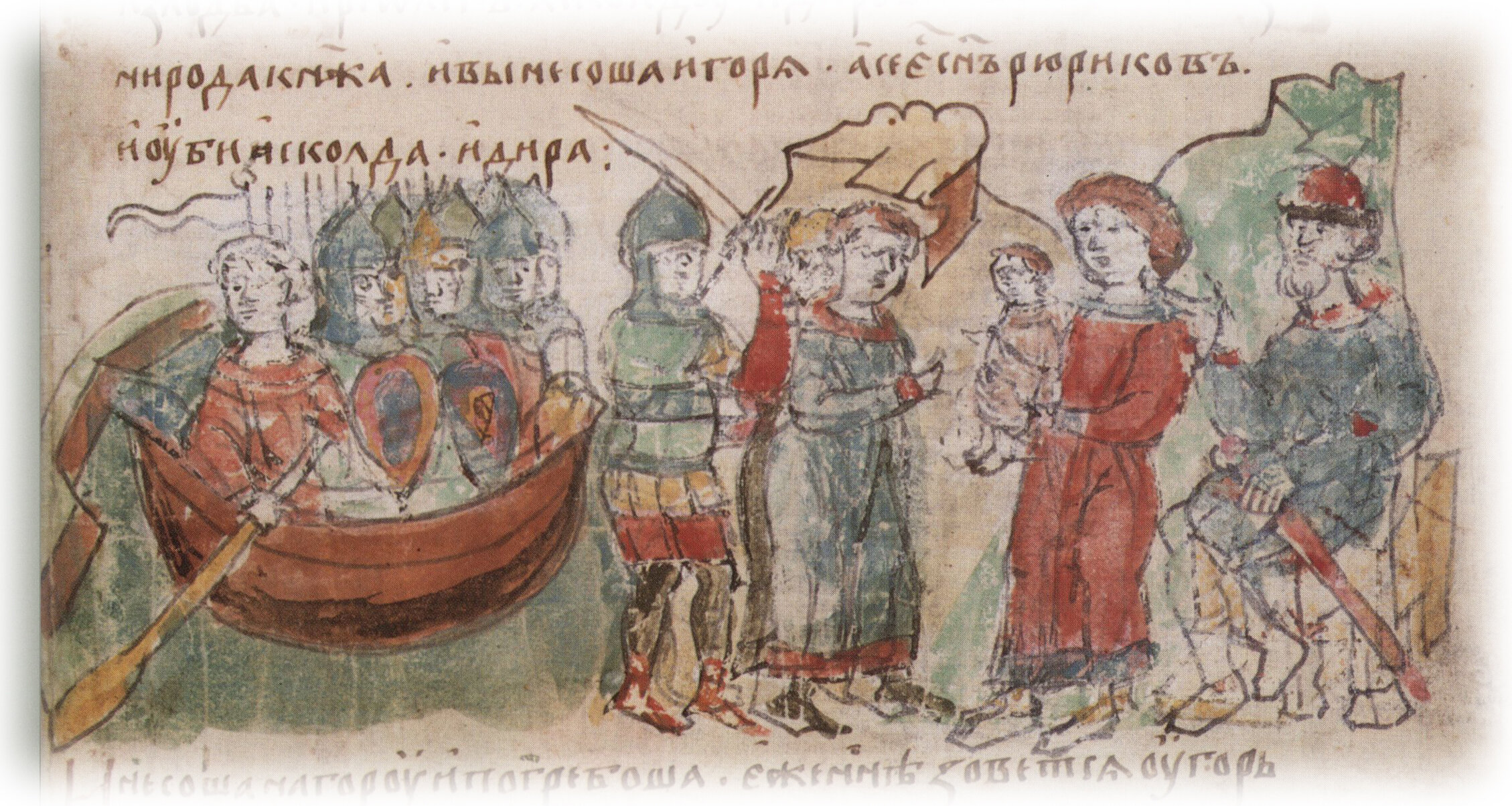 "И приплу под Угорское, похорони воя своа, и посла ко Асколду и Дирови... Асколд же и Дир приидоста, и выскакавше вси прочии из лодьа, и рече Олег Асколду и Дирови: «Вы неста князя, ни рода княжа», и вынесоша Игоря: «А се есть сын Рюриков». И уби Аскол-да и Дира".