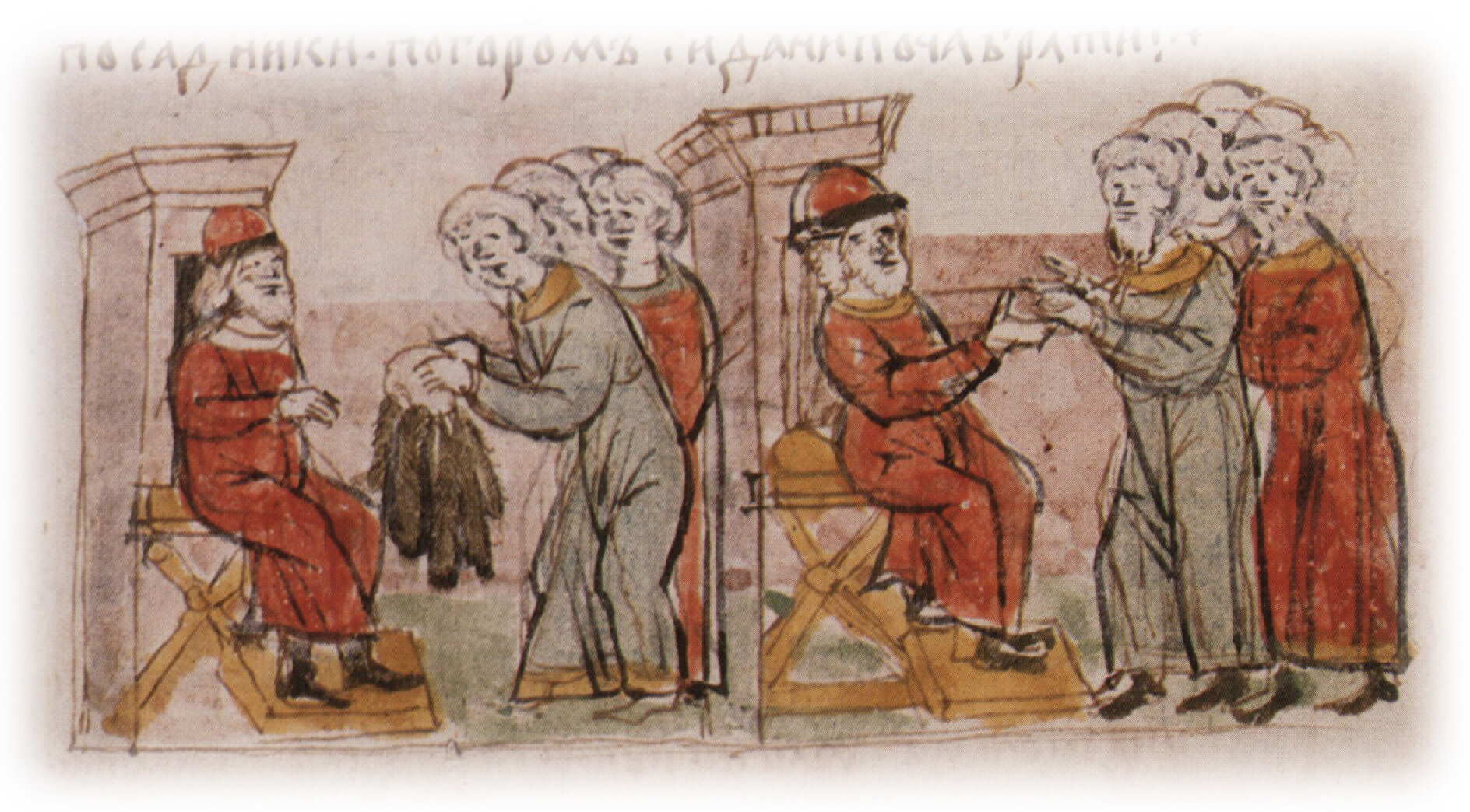 Рисунок "мастера Б" — перо. Правлен (фигуры, лица, шапки, круглый бунт куньих мехов) "мастера В" — кисть.