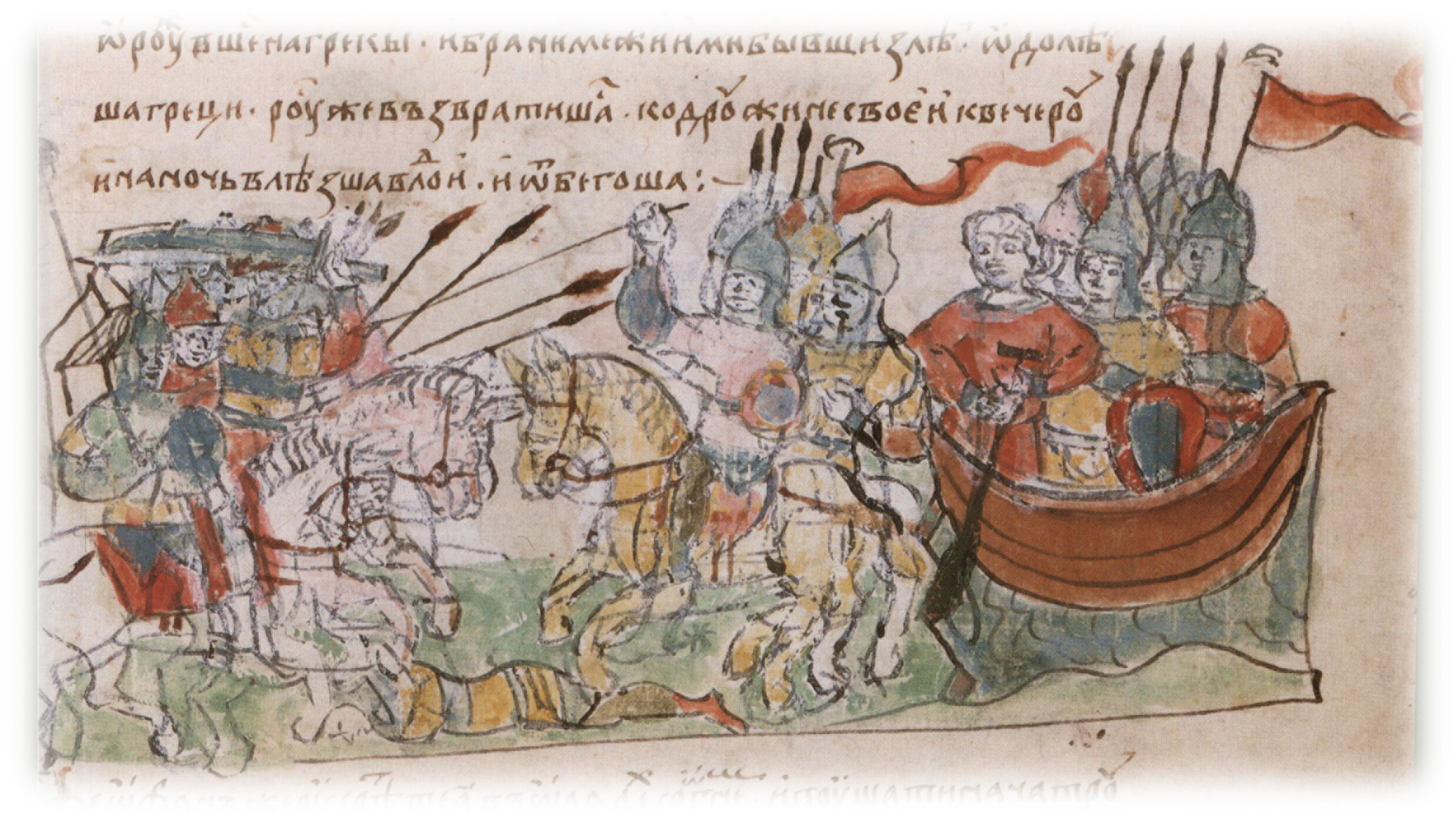 "Потом пришедшим воем от востока... И съвещаша русь, изыдоша въоружившеся, на греки, и брани межи ими бывши зле, одва одолеша греци. Русь же възвратишася ко дружине своей к вечеру и на ночь влезша в лодии, и отбегоша".