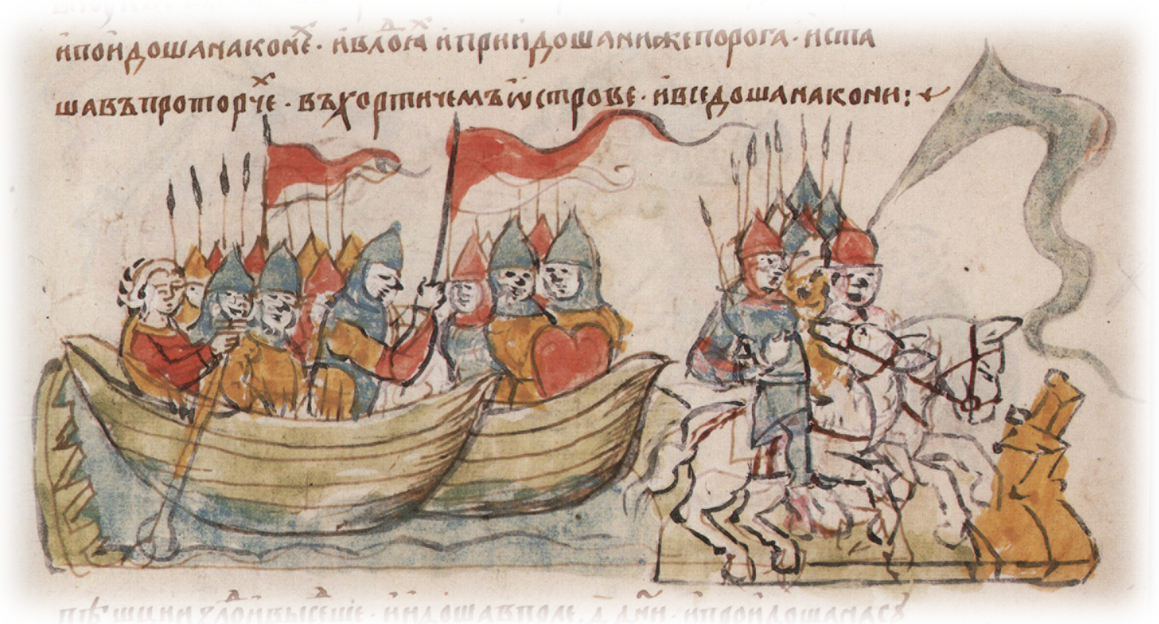 "Володимер же... поиде к Переяславлю, а Святополк по нем, и Да ныл Святославич, и Да-выд Всеславич, Мстислав Игорев внук, Вячеслав Ярополчичь, Ярополк Володимирич. И поидоша на конех и в лодиях, и приидоша ниже порога... И вседоша на кони".