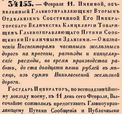 34155. 1855 год. 23 февраля (11 февраля ст.ст.) Именной, объявленный Главноуправляющему Вторым Отделением Собственной Его Импарторскаго Величества Канцелярии Товарищем Главноуправляющаго Путями Сообщения и Публичными Зданиями. О назначении Инспекторам частных железных дорог на прогоны, разъезды и канцелярские расходы, во время производства работ, до сто двадцати пяти рублей в месяц, из сумм Николаевской железной дороги