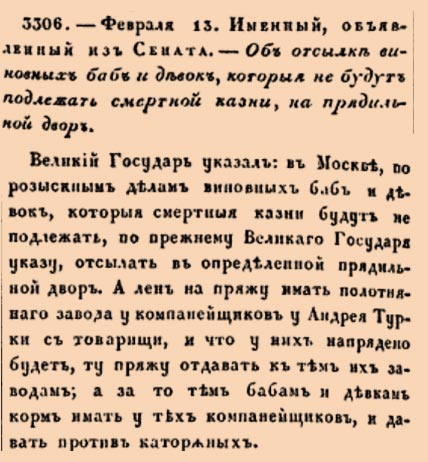 Закон № 3306. 1719 год. 13 февраля (24 февраля).Об использовании труда осужденных женщин на прядильном дворе и порядке их содержания за счет частных заводчиков.