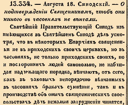 13.334. — Синодский. 18 августа 1769 года.О подтверждении Священникам, чтоб они никого в часовнях не венчали.Святейший Правительствующий Синод из имеющихся в Святейшем Синоде дел усмотря, что в некоторых Епархиях священники не в приходских своих церквах, но в часовнях, не только приходских своих, но и посторонних людей самовольно, не наблюдая надлежащего порядка, венчают, от сего как в таковых непорядочно венчанных в часовнях браках сумнении, так и в производстве об оных священнических своевольствах дел немалые затруднения чинятся