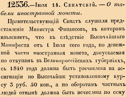 12536. 1839 год. 26 июля (14 июля ст.ст.) Сенатский. О табели иностранной монеты.Правительствующий Сенат слушали представление Министра Финансов, в котором изъясняет, что в следствие Высочайшаго Манифеста от 1 Июля сего года, по денежной части иностранная монета, допускаемая по откупам в Великороссийских губерниях, с 1840 года должна быть расчислена на ассигнации по Высочайше установленному курсу 3 руб. 50 коп. <…>