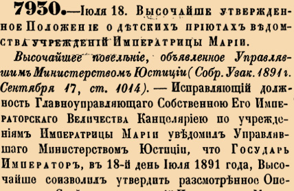 7930. 1891 год. 30 июля (18 июля ст.ст.) Высочайше утвержденное Положение о детских приютах ведомства учреждений Императрицы Марии.Гл.I – Общие основания. #1. Детские приюты ведомства учреждений Императрицы Марии имеют целью: призрение бедных обоего пола детей без различия звания, вероисповедания, сословия и происхождения и доставления им религиозно-нравственнаго воспитания и первоначальнаго образования. Сообразно средствам и местным условиям, детские приюты <...>