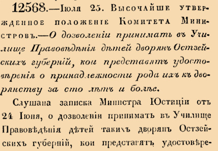 12568. 1839 год. 6 августа (25 июля ст.ст.) Высочайше утвержденное положение Комитета Министров. О дозволении принимать в Училизе Правоведения детей дворян Остзейских губерний, кои представят удостоверения о принадлежности рода их к дворянству за сто лет и более. <…> Директор Императорскаго Училища Правоведения доносит Министру Юстиции, что Высочайше утвержденным Уставом сего Училища дозволено принимать в оное воспитанников токмо из сословия древняго потомственнаго Российскаго дворянства, внесеннаго в 6-ю часть родословной книги <…>