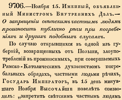 9706. — Ноября 15. Именный, объявленный Министром Внутренних Дел, 1836 год.О запрещении светским частным людям произносить публично речи при погребениях и других подобных случаяхПо случаю открывшихся в одной из губерний, возвращенных от Польши, злоупотреблений в произносимых, при совершаемых Римско-Католическим духовенством погребальных обрядах, частными людьми речах, ГОСУДАРЬ ИМПЕРАТОР, в 15 день минувшего Ноября Высочайше повелеть соизволил: «запретить светским частным людям произносить публично речи при погребениях и других подобных случаях, не токмо в Римско-Католических церквах, возвращенных от Польши, но и вне храмов».