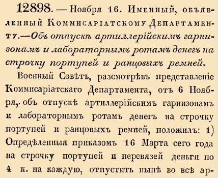 12898. — Ноября 16. Именный, объявленный Коммисариатскому Департаменту, 1839 год.Об отпуске артиллерийским гарнизонам и лабораторным ротам денег на строчку портупей и ранцовых ремнейВоенный Совет, рассмотрев представление Коммисариатского Департамента, от 6 Ноября, об отпуске артиллерийским гарнизонам и лабораторным ротам денег на строчку портупей и ранцовых ремней, положил: 1) Определенные приказом 16 марта сего года на строчку портупей и перевязей деньги по 4 к. на каждую, отпустить ныне во все артиллерийские гарнизоны; исчисленную же посему предмету издержку, составляющую 754 р. 24 к. ассигнациями, по незначительности оной, отнести на счет остатков от сметных сумм, ассигнованных Комиссариату на 1839 год.2) На будущее время при перемене в артиллерийских гарнизонах и лабораторных ротах, прослуживших срок портупей и барабанных перевязей, отпускать на строчку оных по 8 к. на каждую; поелику же для сохранения единооб