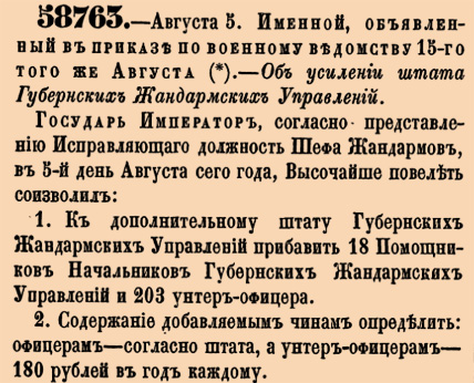 58763. 1878 год. 17 августа (5 августа ст.ст.) Именной, объявленный в приказе по военному ведомству 15-го того же Августа. Об усилении штата Губернских Жандармских Управлений.Государь Император, согласно представлению Исправляющаго должность Шефа Жандармов, в 5-й день Августа сего года, Высочайше повелеть соизволил: 1.К дополнительному штату Губернских Жандармских Управлений прибавить 18 Помощников Начальников Губернских Жандармских Управлений и 203 унтер-офицера. 2. Содержание добавляемым чинам определить: офицерам – согласно штата, а унтер-офицерам – 180 рублей в год каждому <…>