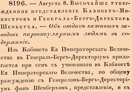 8196. 1740 год. 8 августа (19 августа). Высочайше утвержденное представление Кабинет-Министров и Генерала-Берг-Директора Шемберха. Об отдаче казенных заводов партикулярным людям в содержание.