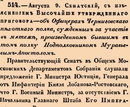 514. 1826 год. 9 августа (21 августа). Об Офицерах Черниговскаго пехотнаго полка, сужденных за участие в мятеже, произведенном бывшим в том полку Подполковником Муравьевым-Апостолом