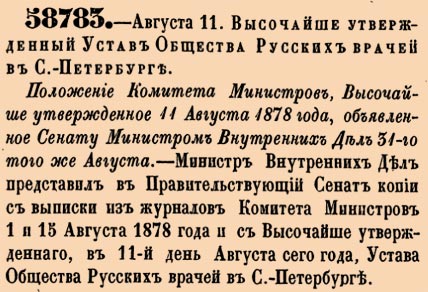 58783. 1878 год. 11 августа (23 августа). Высочайше утвержденный Устав Общества Русских врачей в С.-Петербурге.