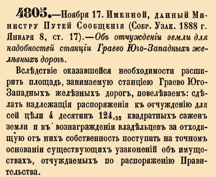 4805. 1888 год. 17 ноября (29 ноября). Именной, данный Министру Путей Сообщения (Собр. Указ. 1888 г. Января 8, ст. 17), 1887 г. Об отчуждении земли для надобностей станции Граево Юго-Западных железных дорог