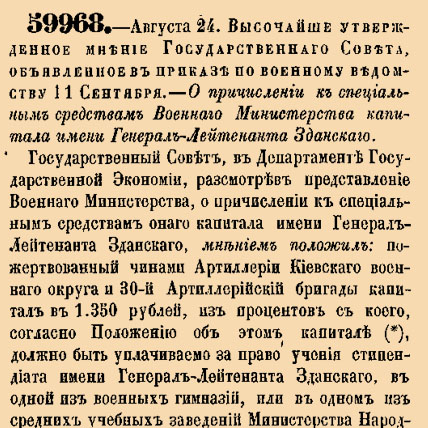 О причислении к специальным средствам Военнаго Министерства капитала имени Генерал-Лейтенанта Зданскаго.