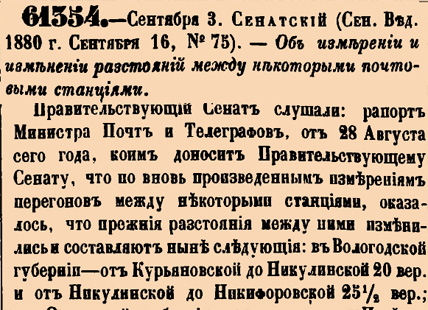 61354. 1880 год. 15 сентября (3 сентября ст.ст.) Об измерении и изменении разстояний между некоторыми почтовыми станциями.Правительствующий Сенат слушали: рапорт Министра Почт и Телеграфов, от 28 Августа сего года, коим доносит Правительствующему Сенату, что по вновь произведенным измерениям перегонов между некоторыми станциями, оказалось, что прежния разстояния между ними изменились и составляют ныне следующия: в Вологодской губернии – от Курьяновской до Никулинской 20 верст и от Никулинской до Никифоровской 25 1\2 верст <…>