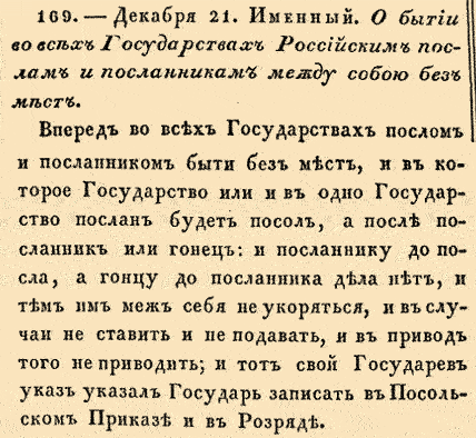31 декабря (21 декабря ст.ст.) Именный.О бытии во всех Государствах Российским послам и посланникам между собою без мест.Вперед во всех Государствах послом и посланникам бытии без мест, и в которое Государство или и в одно Государство послан будет посол, а после посланник или гонец: и посланнику до посла дела нет, и тем им меж себя не укоряться, и в случаи не ставить и не подавать, и в привод того не приводить; и тот свой Государев указ указал Государь записать в Посольском приказе и в Розряде.
