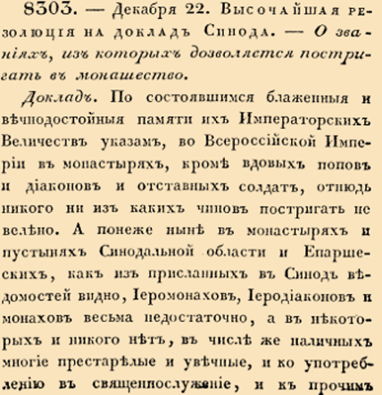 8303. 22 декабря (2 января). Высочайшая резолюция на доклад Синода. О званиях, из которых дозволяется постригать в монашество.
