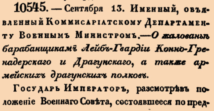10545. 1837 год. 25 сентября (13 сентября ст.ст.). Именный, объявленный Коммисариатскому Департаменту Военным Министром. О жаловании барабанщикам Лейб-Гвардии Конно-Гренадерскаго и Драгунскаго, а также армейских Драгунских полков.Государь Император, разсмотрев положение Военнаго Совета, состоявшееся по представлению Коммисариатскаго Департамента от 16 Августа, Высочайше повелеть соизволил: барабанщикам Лейб-Гвардии Конно-Гренадерскаго и Драгунскаго, а также армейских Драгунских полков, производить жалованье наравне с трубачами, в сих полках состоящими.