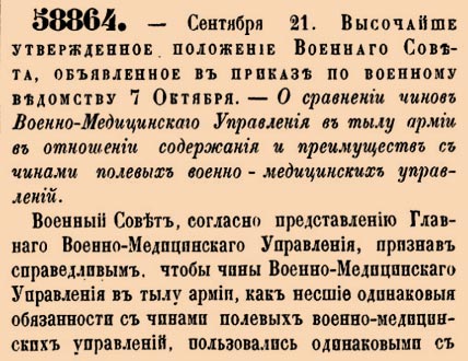 Положение 1878 года приравняло в правах и жаловании чинов Военно-медицинского управления в тылу армии к их коллегам в полевых управлениях. Документ детализировал размеры содержания, классы должностей, порядок выплат и предоставляемые льготы, обеспечивая единообразие условий службы медицинского персонала армии.
