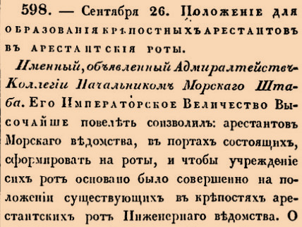 598. 1826 год. 8 октября (26 сентября ст.ст.) Положение для образования крепостных арестантов в арестантския роты.Именный, объявленный Адмиралтейств-Коллегии Начальником Морскаго Штаба. Его Императорское Величество Высочайше повелеть соизволил: арестантов Морскаго ведомтсва, в портах состоящих, сформировать в роты, и чтобы учреждение сих рот основано было совершенно на положении существующих в крепостях арестантских рот Инженернаго ведомства <…>